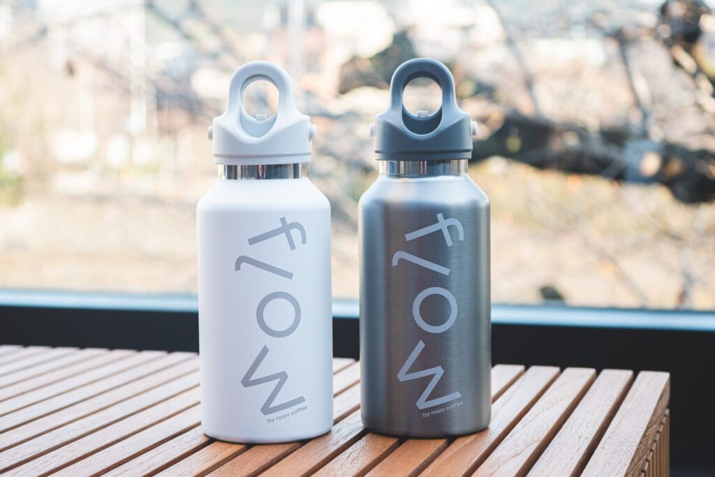 flowでは、アメリカ発の真空断熱ボトルブランド「REVOMAX(レボマックス)」とのコラボレーションボトルを販売するほか、NOZY COFFEEのコーヒー粕で染め上げたサステナブルなオリジナル手ぬぐいも展開予定です。