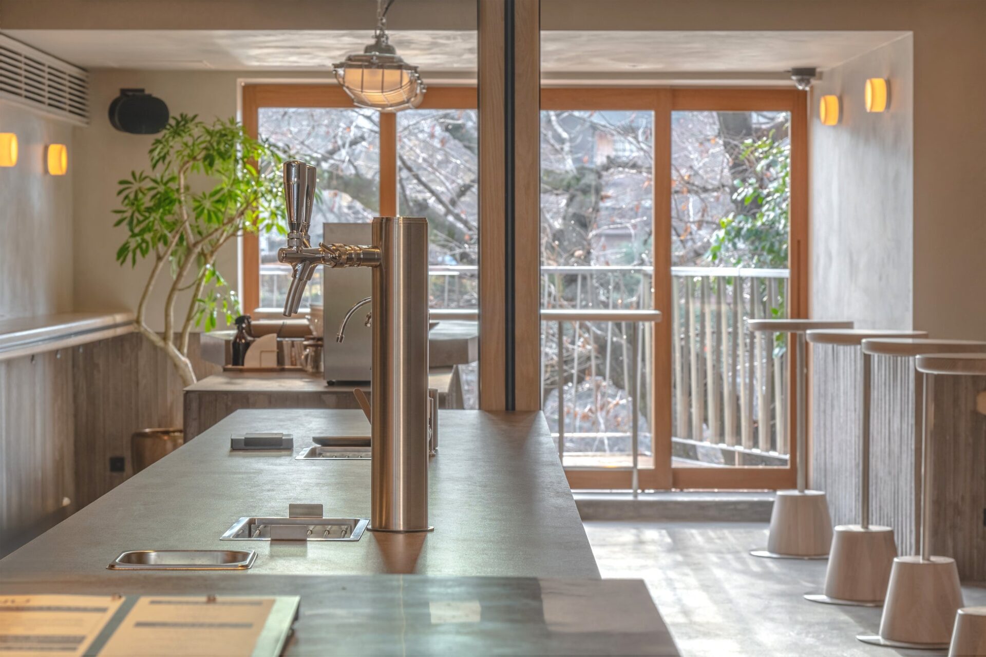1階はスタンディングカウンターを中心としたレイアウト。バリスタの抽出プロセスを忠実に再現できるハンドドリップマシンをカウンターに設置したことで、コーヒーを淹れている時間にも自然とバリスタとコミュニケーションが生まれ、その豆のストーリーに深く触れるなど、コーヒー体験がより多角的に広がる空間に仕上げています。夜は落ち着いた照明のもと、カクテルやクラフトビールなど思い思いの一杯をゆっくりとお楽しみいただけます。