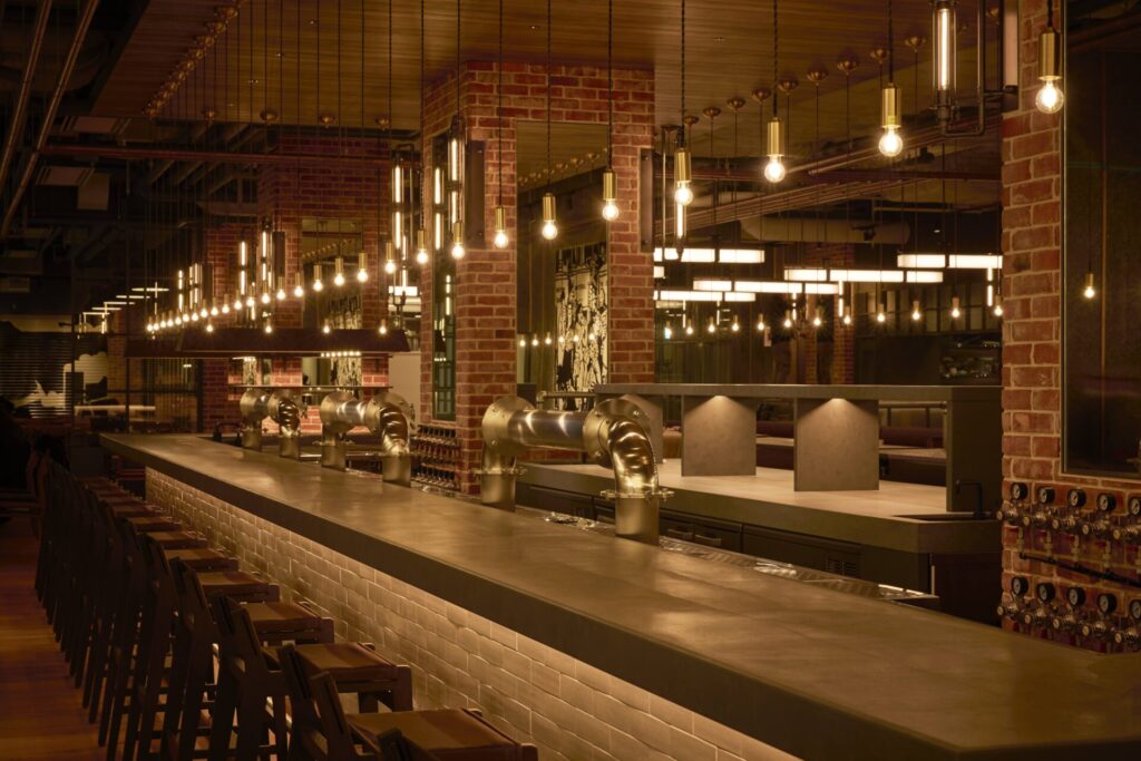 店の中央には28個のタップが並ぶ巨大カウンターがあり、スタッフや隣の客と自然に会話が生まれる一体感を演出します 。