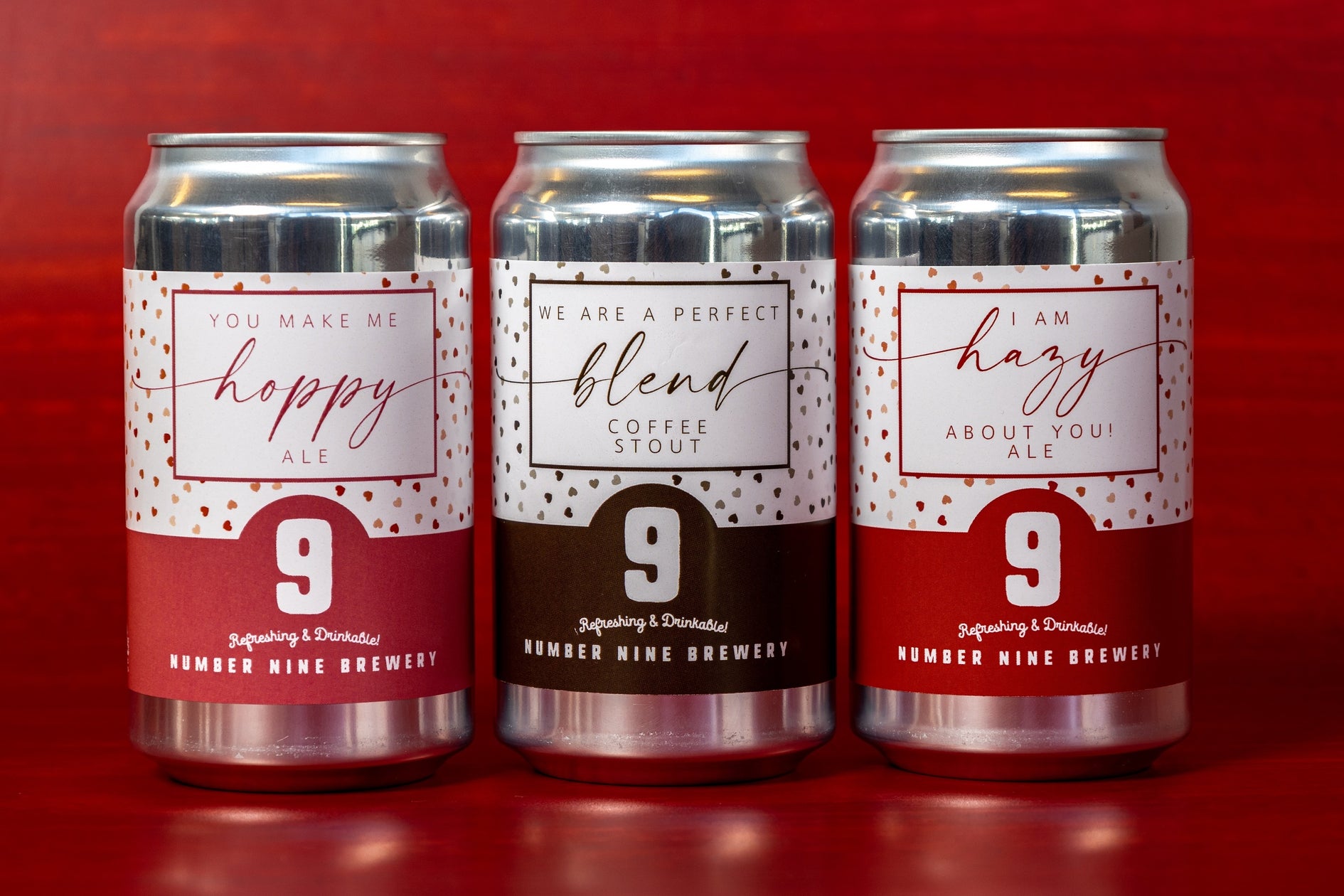 今回は、ニュージーランドでビール造りを行っていた経験を持つNUMBER NINE BREWERYの醸造責任者 齋藤健吾が「HAMMER HEAD ALE」(ハンマーヘッド・エール)、「#9 HAZY」(ナンバーナイン・ヘイジー)、「COFFEE STOUT」(コーヒースタウト)のおすすめ3種をチョイス。それぞれ、赤・ピンク・茶色の小さなハートマークが散りばめた限定ラベル缶にお詰めし、特別感を演出いたしました。