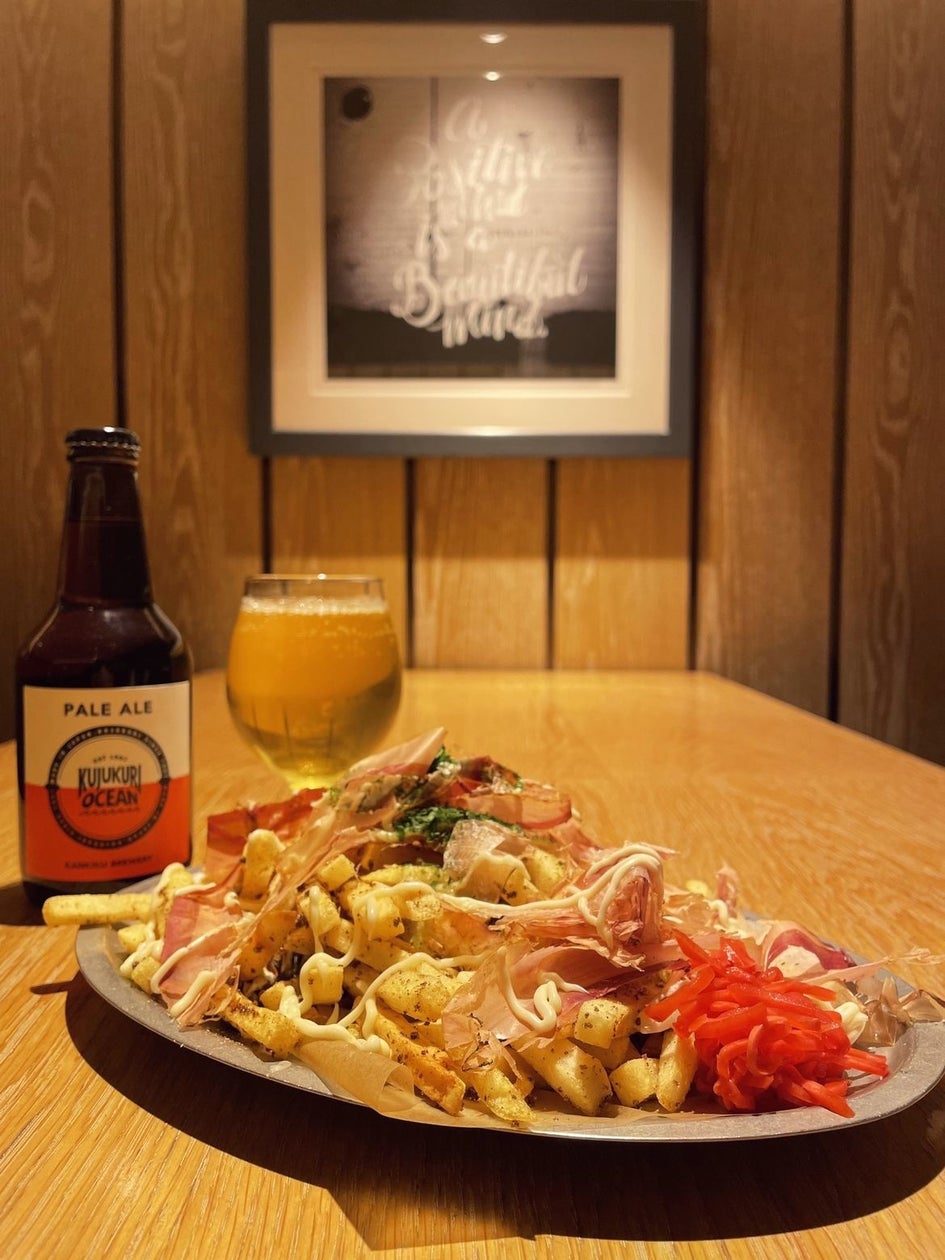 チェダーチーズやチリコンカンビーンズが乗ったポテトは後を引く旨さ。対照的な爽やかな口当たりが、ポテトを飽きさせず相性良し。