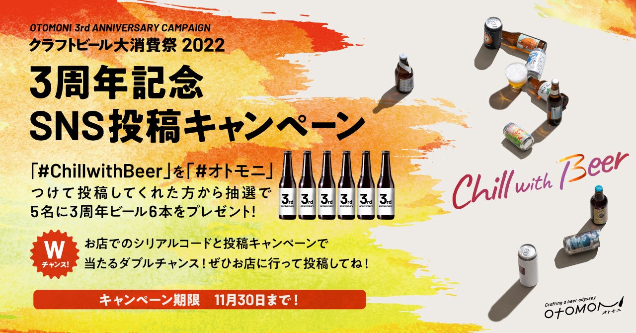 クラフトビールのサブスク「Otomoni(オトモニ)」を運営するmeuron株式会社(本社:東京都豊島区 代表取締役:金澤俊昌)はサービス開始3周年を記念してクラフトビールをさらに楽しんでいただきながら、「いつもと違う環境」でゆっくりとした時間を過ごしてもらうために全国43のブルーパブやタップルームで飲むとクラフトビールが当たるキャンペーン「全国クラフトビール大消費祭2022!」を開催中。その一環でTwitterとInstagramで「#ChillwithBeer」「#オトモニ」のハッシュタグをつけて投稿すると抽選で5名に3種年記念クラフトビール6本セットが当たるキャンペーンを開催します。お店でのシリアルコードとSNS投稿の二重で当たるかもしれないダブルチャンスキャンペーンに。