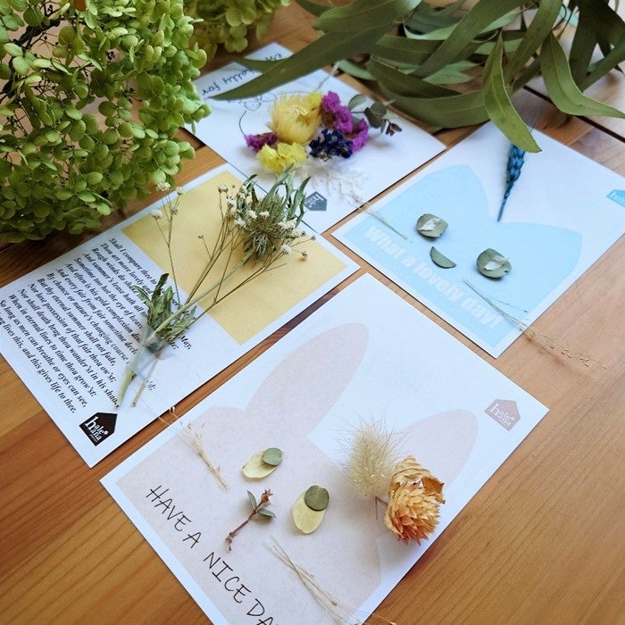新所沢駅から徒歩1分のフラワーショップ「hale-hana plants+」(運営:西武緑化管理)による、ロスフラワーを活用したエシカルなフラワーカード作り体験。カードの上にロスフラワーや葉っぱを自由に置いて、世界に一つだけのオリジナルフラワーカードに仕上げます。写真たてに入れて飾るととても素敵です。