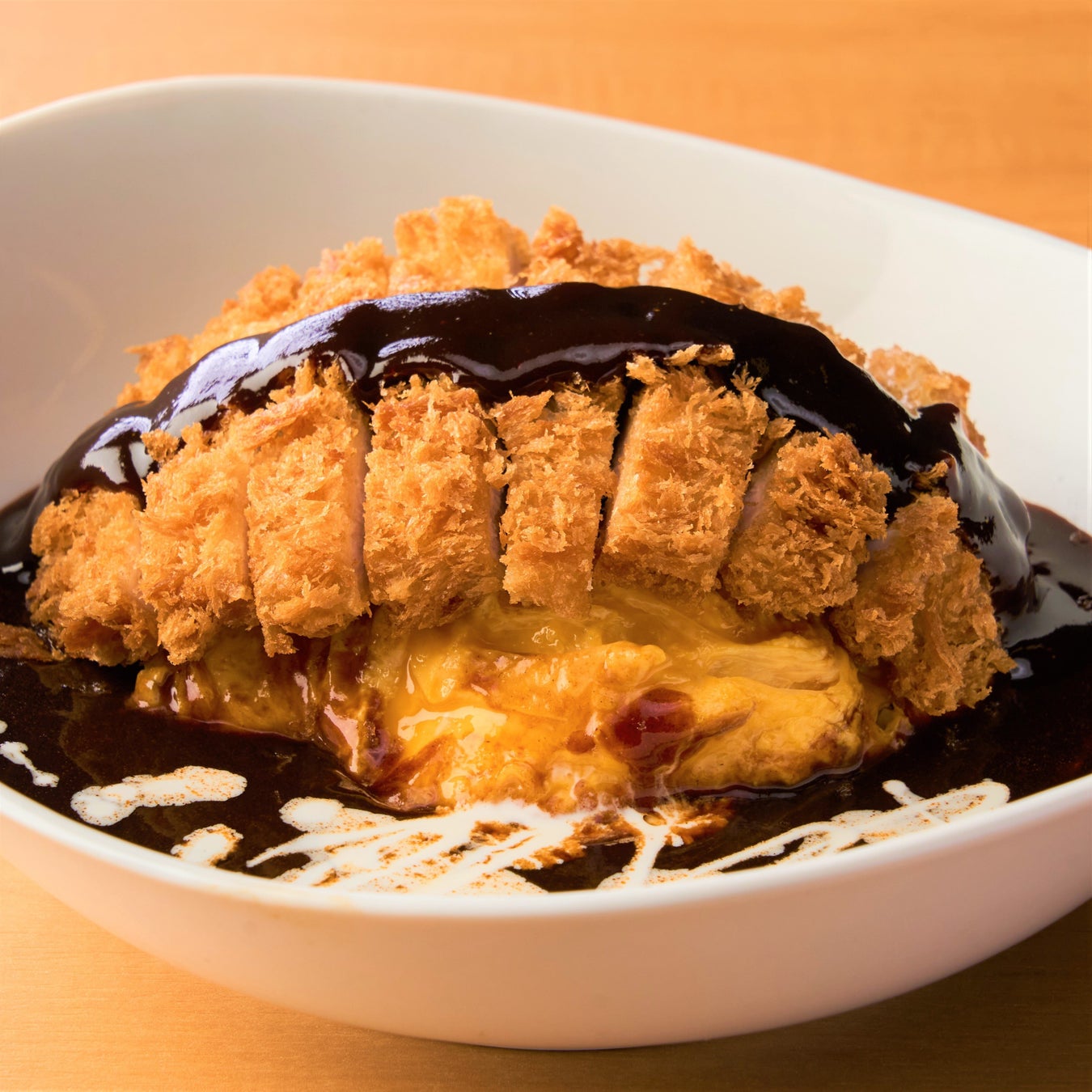 新・名古屋名物のご提案!デミグラスソースのオムライスに赤味噌とんかつをドンッと乗せたボリューム満点の1品です。