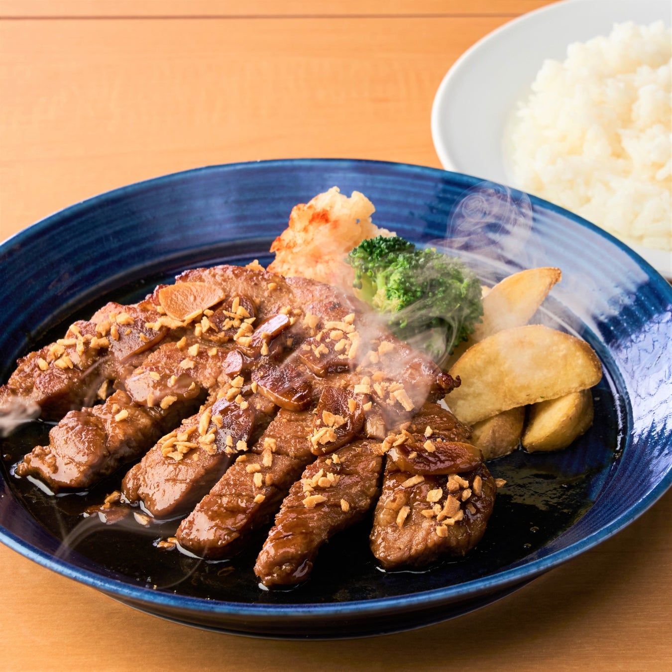 三重県四日市市の名物グルメ・トンテキをご用意!柔らかな厚切りの豚肉にソースがしっかり沁み込んでいてご飯が進む一皿です。