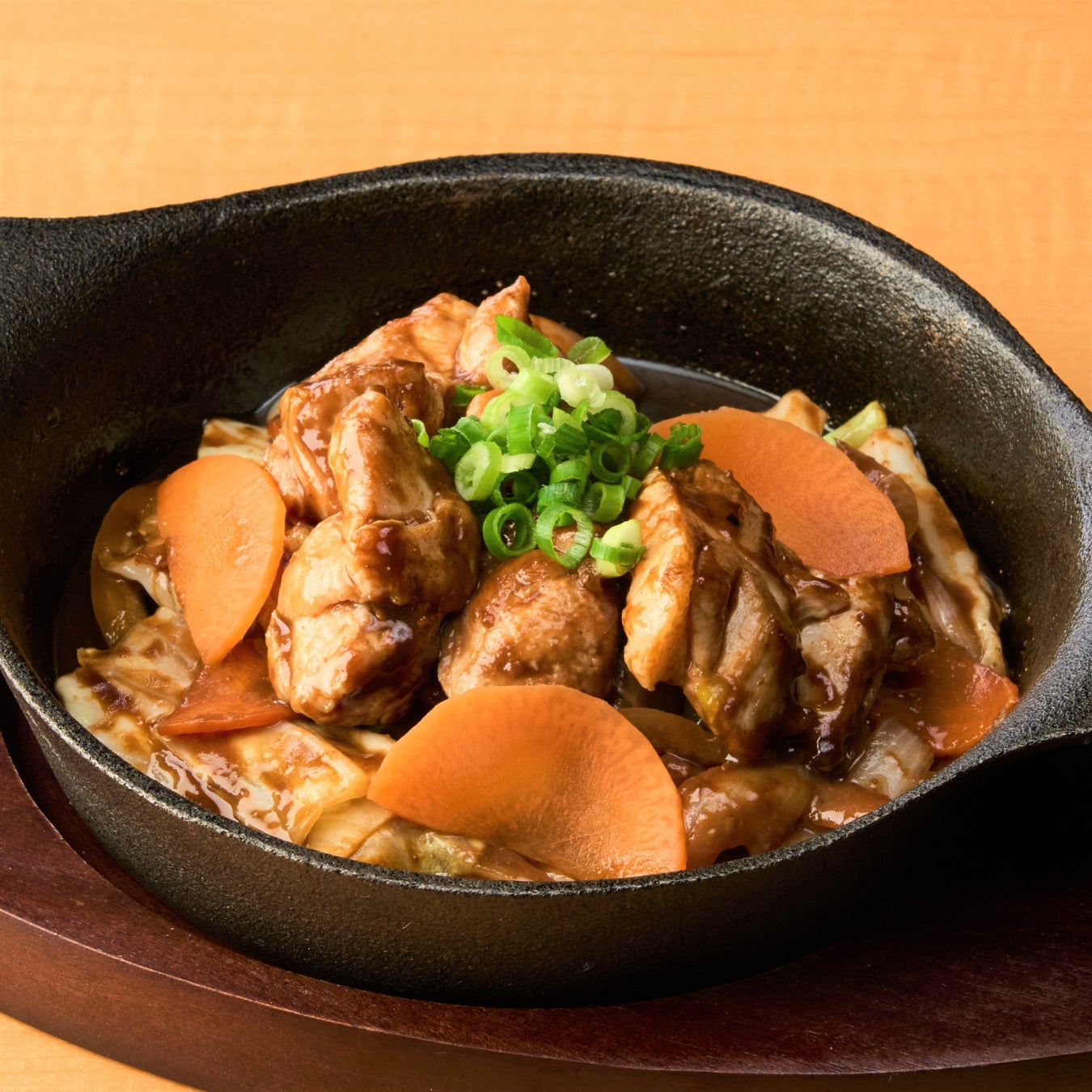 鶏もも肉と野菜を特製だれで炒めた岐阜県奥美濃の郷土料理。当店では味噌ベース味付けに仕上げました。