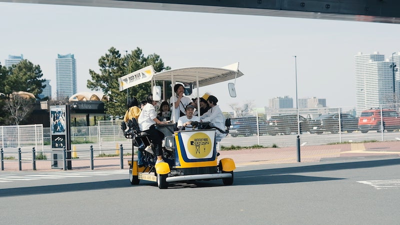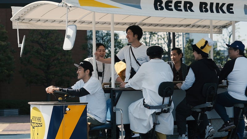 「横浜ビアバイク」は、自転車大国と呼ばれるオランダ発祥の「移動式ビアカウンター」です。国内で初めて運用を始めた横浜の「ビアバイクツーリズム」では、6人の搭乗者がビールを燃料に、ペダルを漕いで横浜の街並みとブルワリーを巡ります。また、個性豊かなガイド(中央)と、演者(後部座席)による生演奏が体験を盛り上げます!