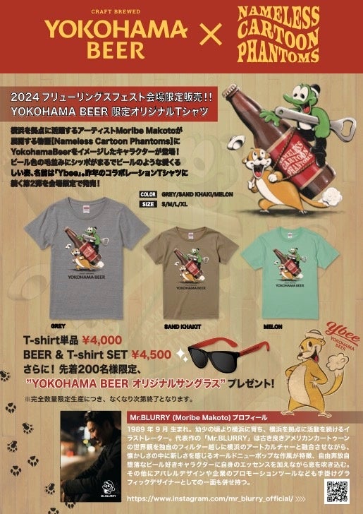 横浜を拠点に活躍するアーティストMoribe Makoto(https://ncpartwork.jimdofree.com/)が展開する物語「Nameless Cartoon Phantoms」とのコラボTシャツが昨年に引き続き発売決定!横浜ビールをイメージしたキャラクターYbeee(ワイヴィー)が描かれたTシャツです。