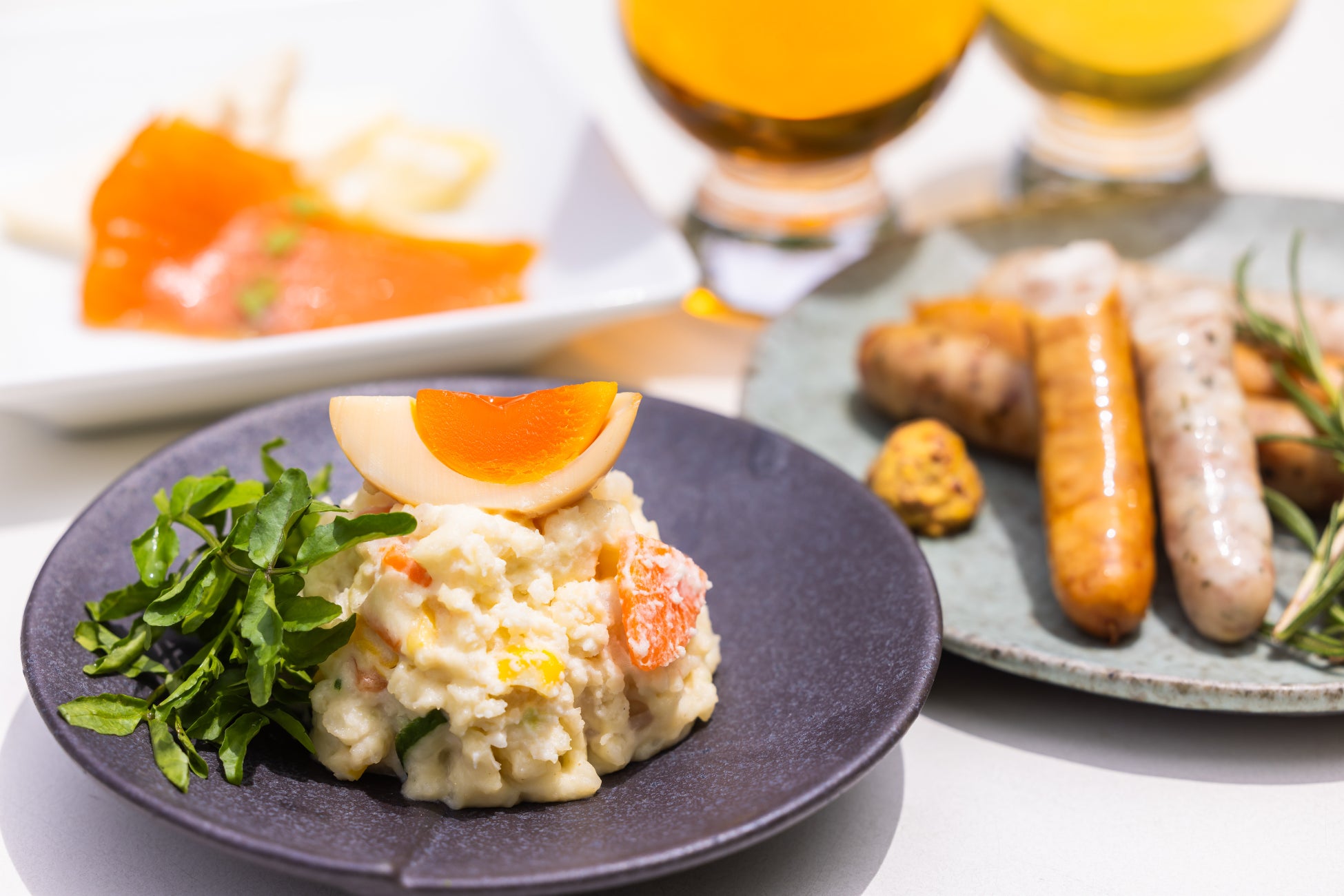 おすすめのフードメニューは、信州の特産品である味噌の製造過程で生じる「味噌たまり」で味付けした卵が特徴の「味噌たまポテトサラダ」です。この料理は、「よなよなエール」の麦芽由来の香ばしさと、まろやかな味噌の甘みがよく合い、ビールのコクを引き立てます。他にも「信州スモークサーモンのチーズ添え」や「ソーセージの盛り合わせ」など、ビールとの組み合わせを楽しめるフードを用意します。