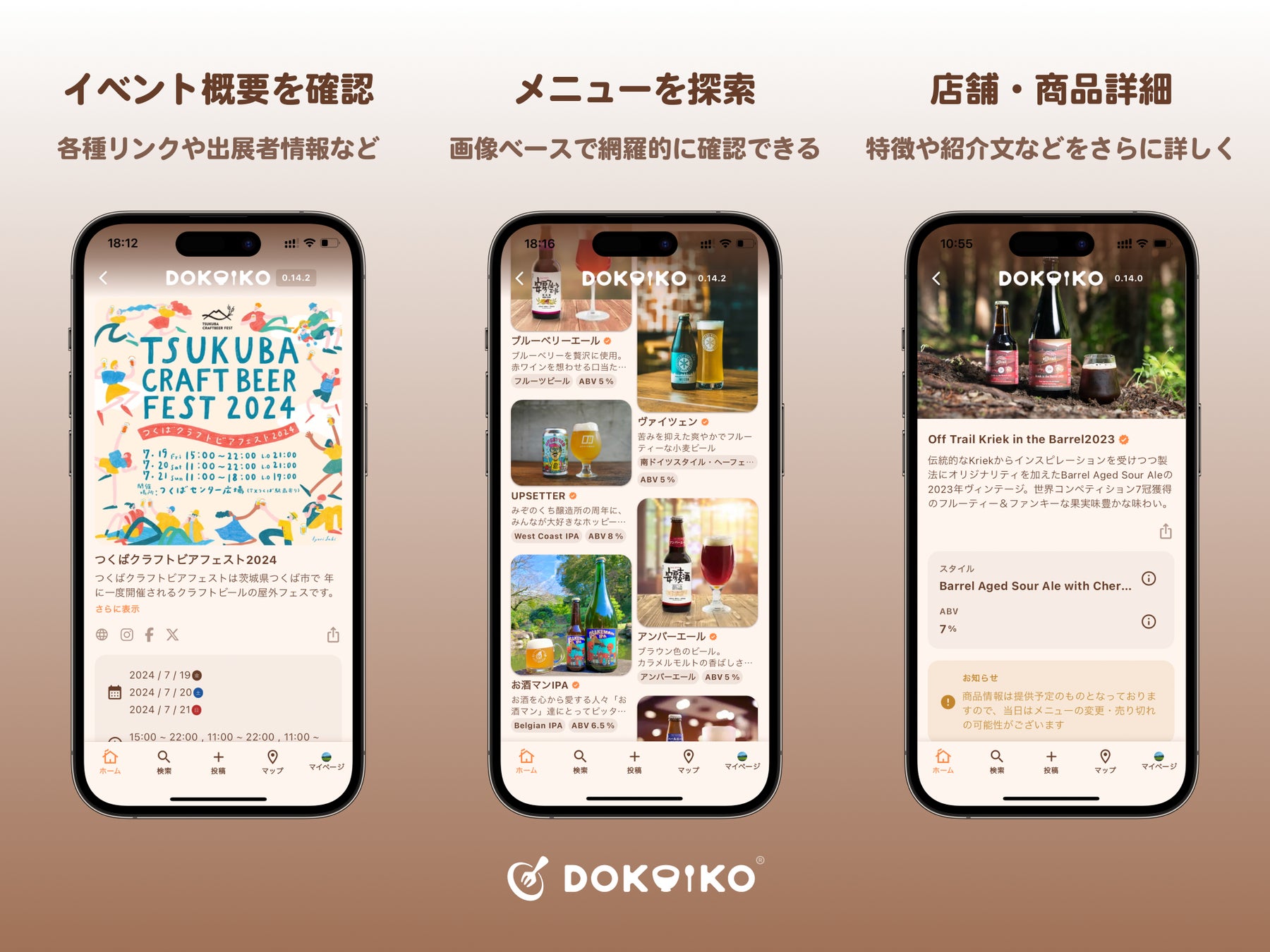 - 以下のリンクにPC、スマートフォン等からアクセスします。https://dokoiko.app/events/tsukubacraftbeerfest2024(iPhone、Androidアプリ内「ホーム」上部の「つくばクラフトビアフェスト」タブからもご覧いただけます。)