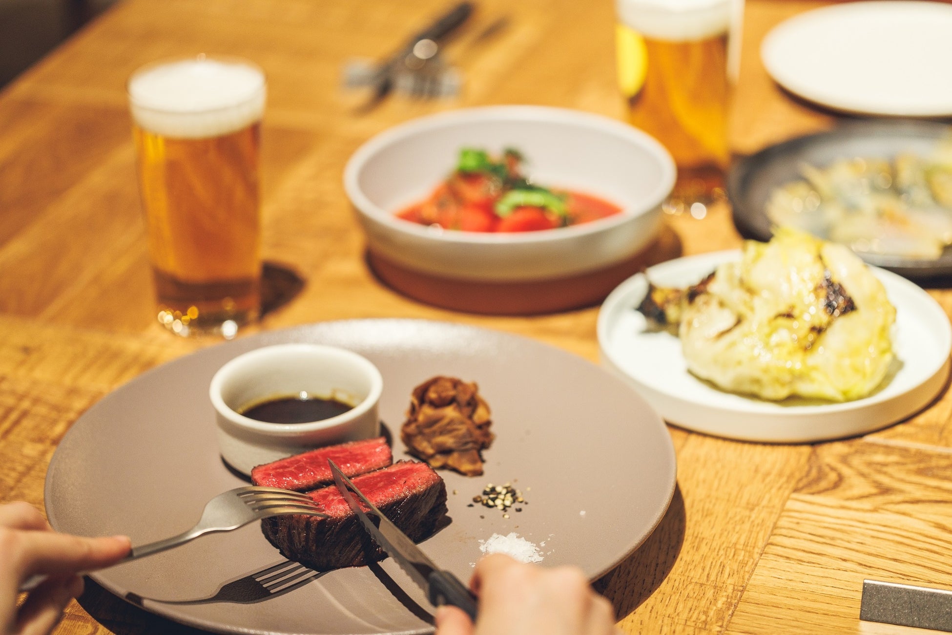 「Meinohama Brewery」で醸造されたクラフトビールは、「kubelto」のダイニングやバーカウンターはもちろん、MEINOHAMA STEPS5階のビアテラスでもお楽しみいただけます。姪浜や糸島の素材をダイナミックに薪火で焼き上げたkubeltoの料理と共にぜひお楽しみください。